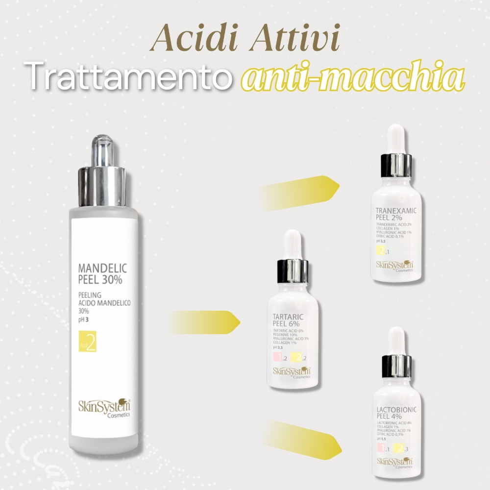 Das Peeling mit Säuren ist eine der wirksamsten Behandlungen, um einen Anti-Flecken-Effekt auf der Haut zu erzielen, da es dazu beiträgt, die Zellerneuerung zu stimulieren und die Hauttextur zu verbessern.
