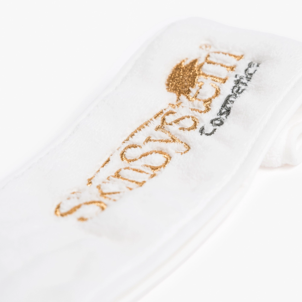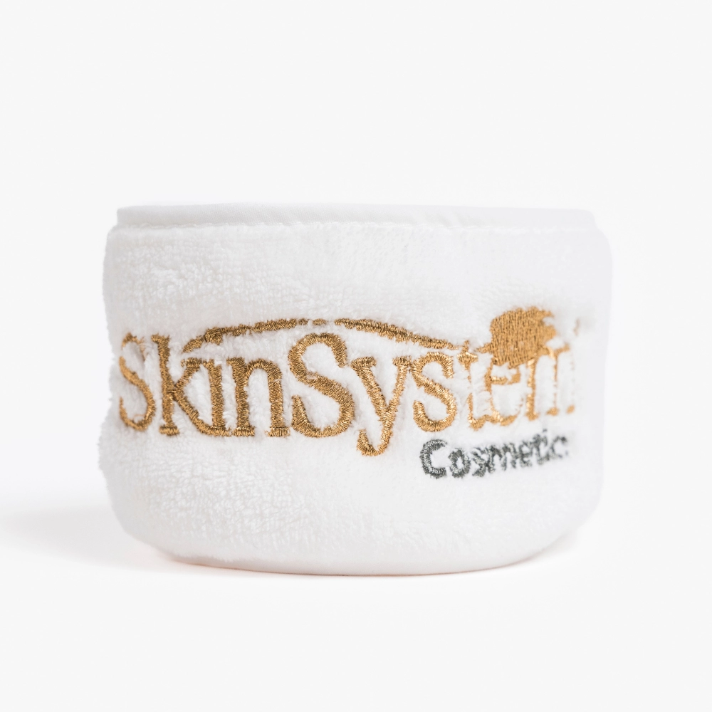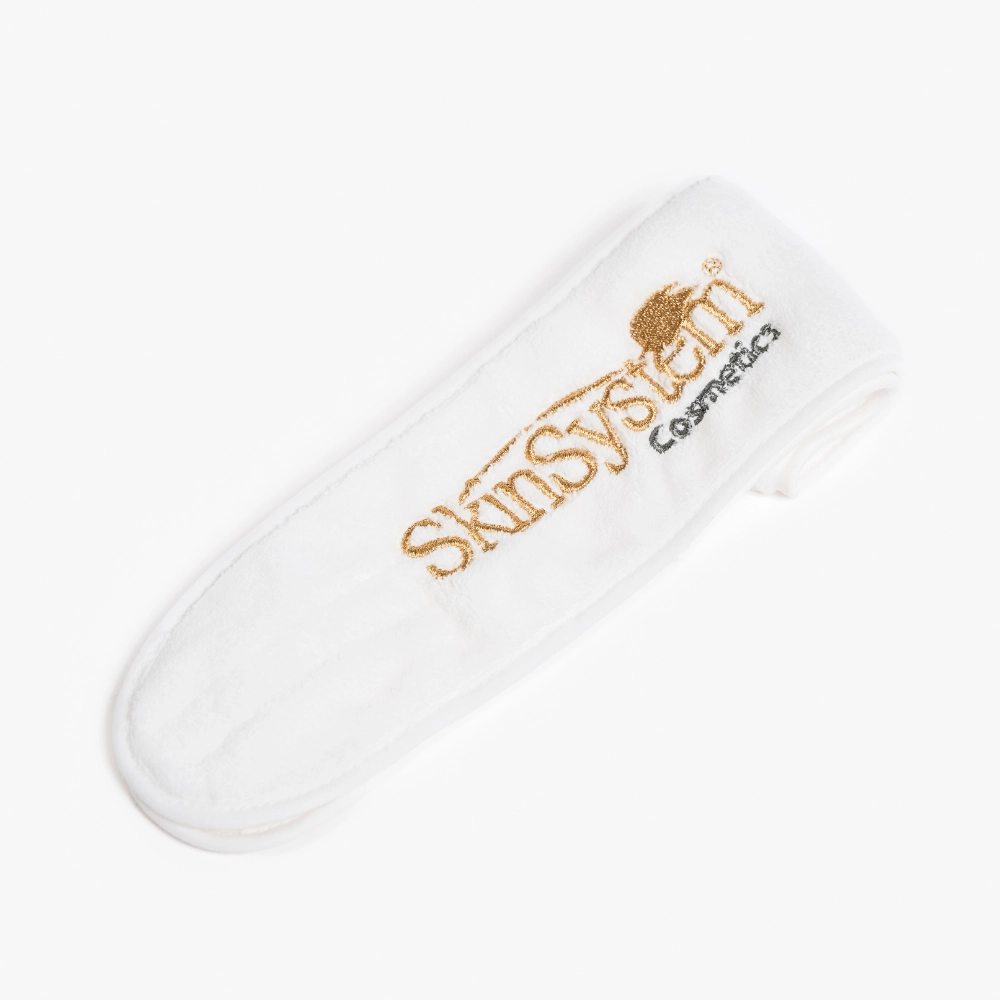 Weiches Frottee-Stirnband mit verstellbarem Verschluss, ideal zum Halten und Schützen der Haare während kosmetischer Behandlungen. Erhältlich in Rosa und Weiß.