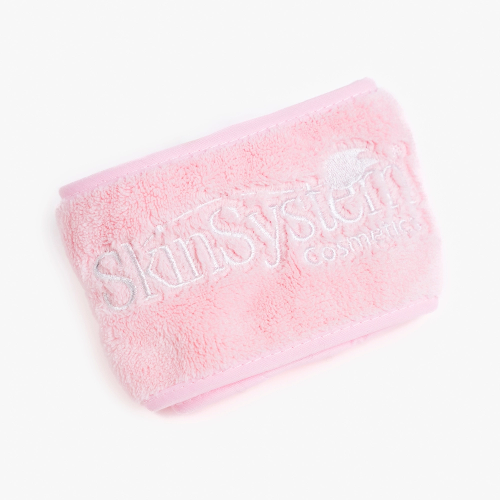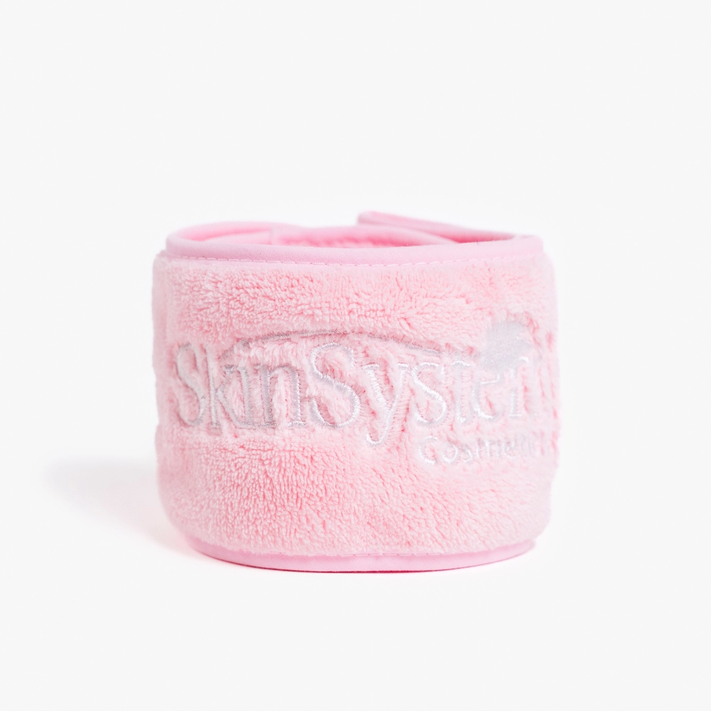 Weiches Frottee-Stirnband mit verstellbarem Verschluss, ideal zum Halten und Schützen der Haare während kosmetischer Behandlungen. Erhältlich in Rosa und Weiß.